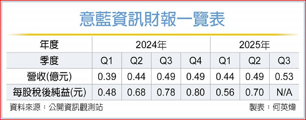 2025年意藍資訊前三季營收1.46億元,年增9.97%,上半年每股稅後純益1.26元,優於去年同期的1.16元。該公司表示,由於不少專案將於第四季認列,今年整體的營收成長率會優於前三季。