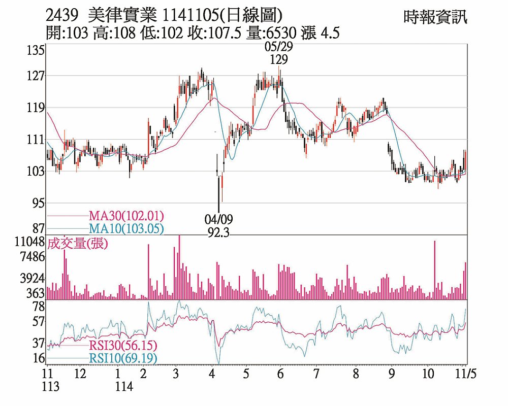 美律(2439)5日受外資由賣轉買帶動,盤中逆勢震盪走高,早盤以103元開出後,終場收在107.5元,漲幅4.37%,成交量6,530張,其中外資買超3,687張。