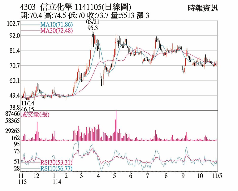 信立(4303)與世紀*(5314)聯合公開收購星雲電腦達陣,加上本業持穩推展,5日在特定買盤拉抬下,終場上漲4.24%、收73.7元,成交張數比前一交易日倍增至5,443張。其中,外資買超1,275張、自營商加碼397張。短線多空量能由弱轉強,KD值黃金交叉。