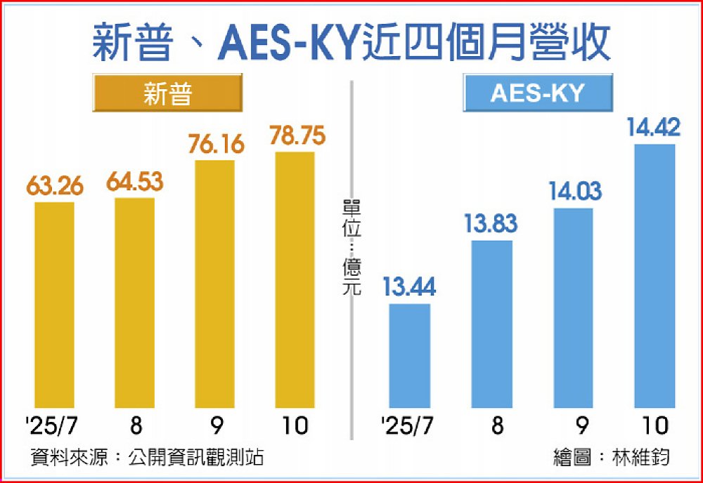 新普(6121)及AES-KY(6781)公布10月營收,雙雙繳出年月雙增好成績。AES-KY在BBU業務續增帶動下,10月營收續攀單月新高、來到14.42億元,月增2.81%、年增51.52%。新普10月營收78.75億元,月增3.41%、年增0.05%,也寫下近13個月以來的高點。