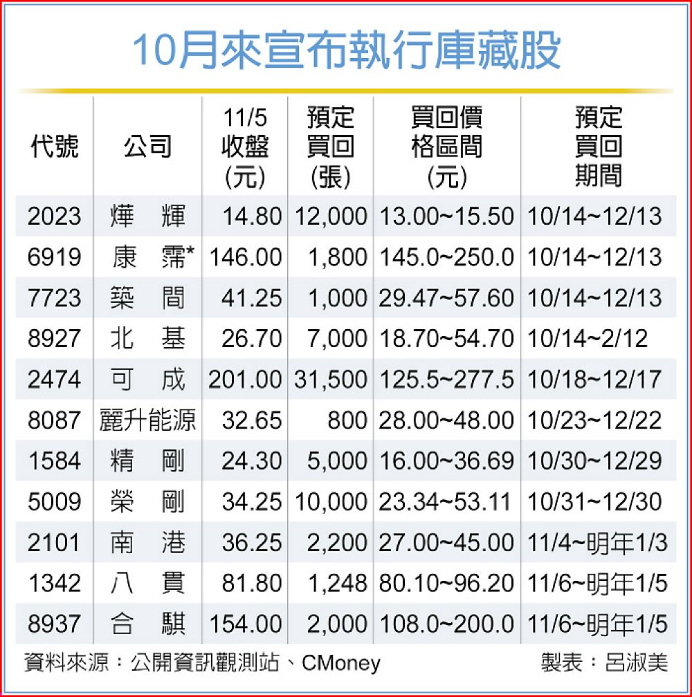 據統計,10月台股大漲2,416點、櫃買表現雖相對弱勢,但仍收小漲,而10月仍有燁輝、康霈*、築間、北基、可成、麗升能源、精剛、榮剛等宣布加入庫藏股;甫進入11月,台股震盪加劇,也有上述3家宣布,合計10月來已有11家上市櫃公司加入庫藏股行列。