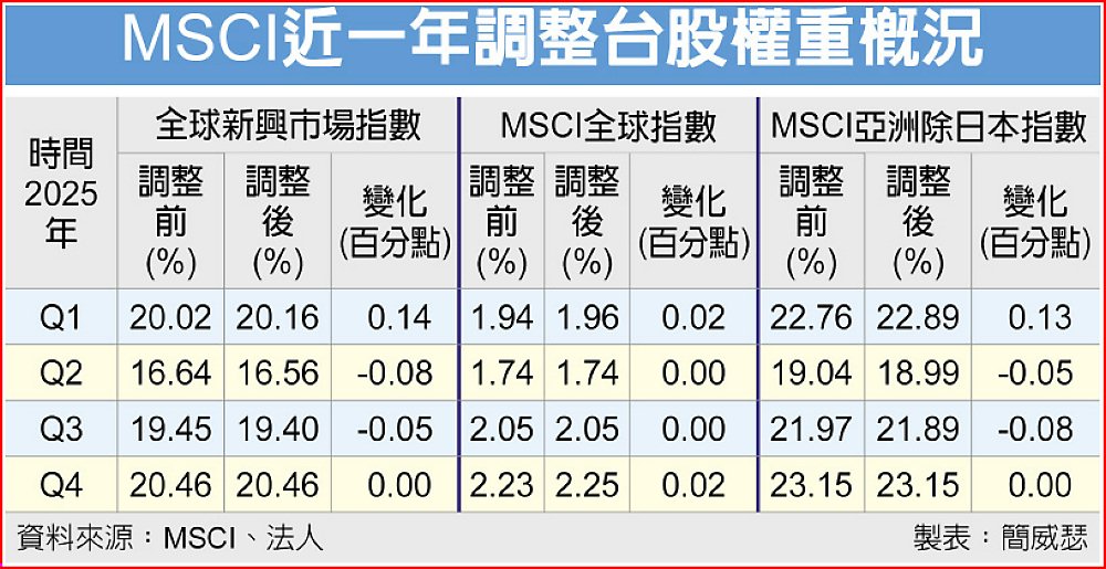 台股在MSCI全球新興市場指數權重維持20.46%、在MSCI亞洲除日本指數權重維持23.15%,本次調整形成一升二持平狀態;相較第二、三季調整均為二降一持平,明顯好上不少,大致呼應台股近期強勢表現,亦印證統一投顧、兆豐國際投顧、台新投顧先前預測台股權重將獲上調。