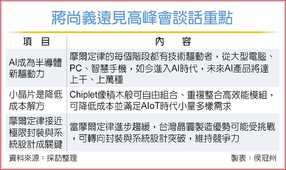 蔣尚義認為,AI應用多樣化,不是每個產品都適合高成本設計流程。舉例來說,台積電5奈米以下產品設計費用大約是20億美元,若一間設計公司先投資2億美元,產品要賣10億美元才能收回成本;但未來AI產品多元化,不是每個產品都能賣這麼大的量。