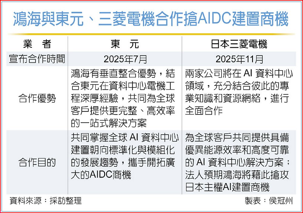 另外,鴻海6日宣布與三菱電機株式會社簽署合作備忘錄(MoU),目標為全球客戶共同提供具備優異能源效率和高度可靠的AI資料中心解決方案;法人預期,鴻海與三菱電機合作將有利於擴大布局模組化資料中心市場,搶攻AI資料中心(AIDC)建置商機。