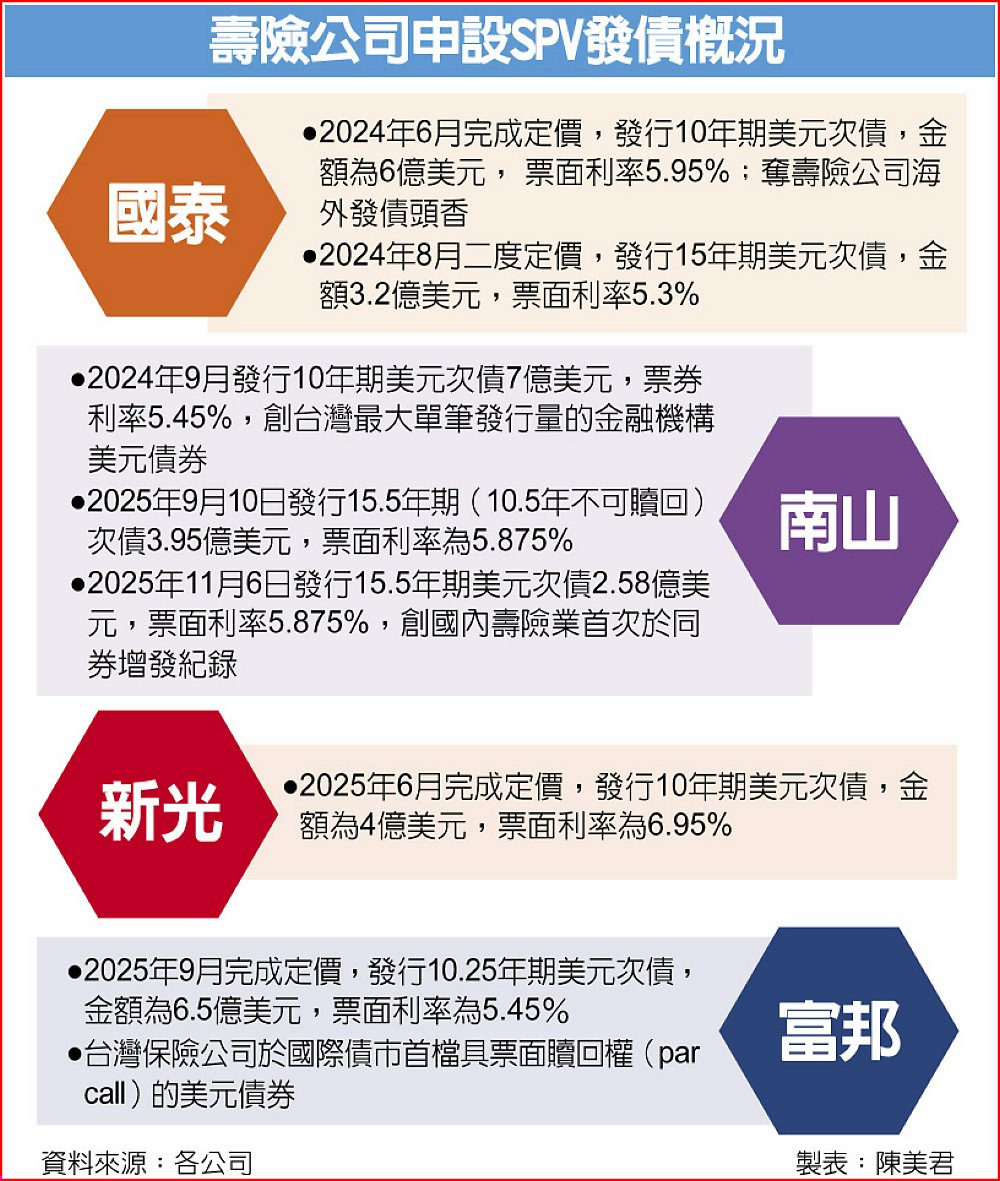 壽險業2026年元旦將接軌「新一代清償能力制度」(TW-ICS),壽險公司持續發債厚實資本。據統計,國泰、南山、富邦與新光等四大壽險公司已七度赴海外發債,累計發行金額為33.23億美元,以新台幣匯率30.9元估算,累計發債金額達1,026.8億元、突破千億元規模。