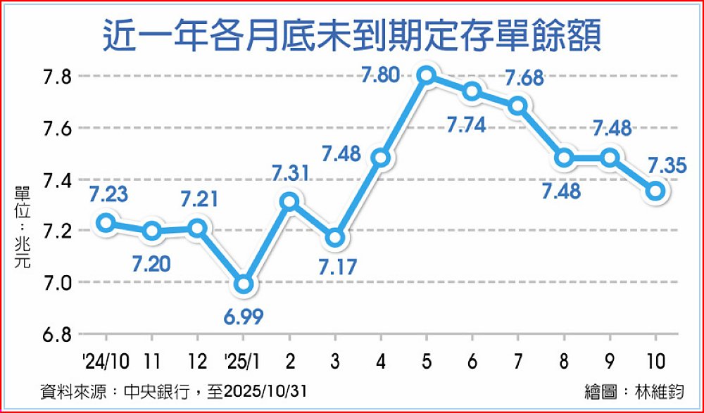 新台幣匯率10月回貶,外資大幅匯出,匯價逐步回測31元整數關卡,市場資金相對先前趨緊。為此,中央銀行公開市場操作反向放錢,累計至10月底未到期定存單餘額大減逾千億元,餘額降至7.35兆元,創近七個月新低。
