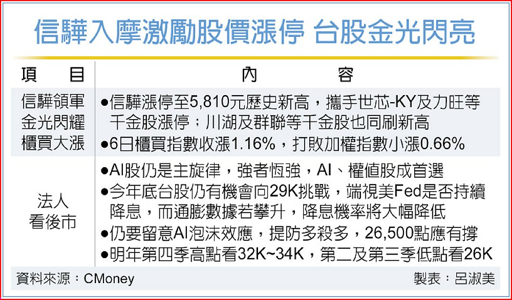 MSCI半年度調整,股王信驊首納入成份股,6日應聲漲停,攜手力旺及群聯等上櫃千金股漲停或創新高,4,000元俱樂部的川湖及準千金勤誠也齊創高,不只帶動盤面「金」光閃閃,更助功櫃買指數大漲1.16%;相形之下,加權指數因台積電尾盤摜殺10元,三大關卡28,000點、5日及10日得而復失,呈現守月線反彈格局。