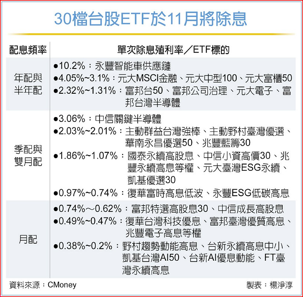 11月初的ETF除息秀於6日順利落幕,接下來還有多檔台股ETF將於17日至25日除息,目前已有30檔公布配息金額,整體規模超過兆元,預估將配發超過190億元資金活水,包含國泰永續高股息、富邦台50、復華台灣科技優息等重量級台股ETF,主動野村臺灣優選也迎來首次配息。