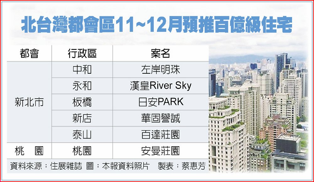 今年剩下最後一季,住展雜誌6日公布最新調查指出,北台灣預期11、12月,推出的住宅類破百億元指標案,驚見六大指標案醞釀登場,包括新北市中和「左岸明珠」、永和「漢,皇River Sky」、板橋「日安PARK」、新店「華固譽誠」、泰山「百達莊園」,及桃園「安曼莊園」,若如期推出,年尾房市可望「有出息」,北台灣全年推案量力守兆元大關。