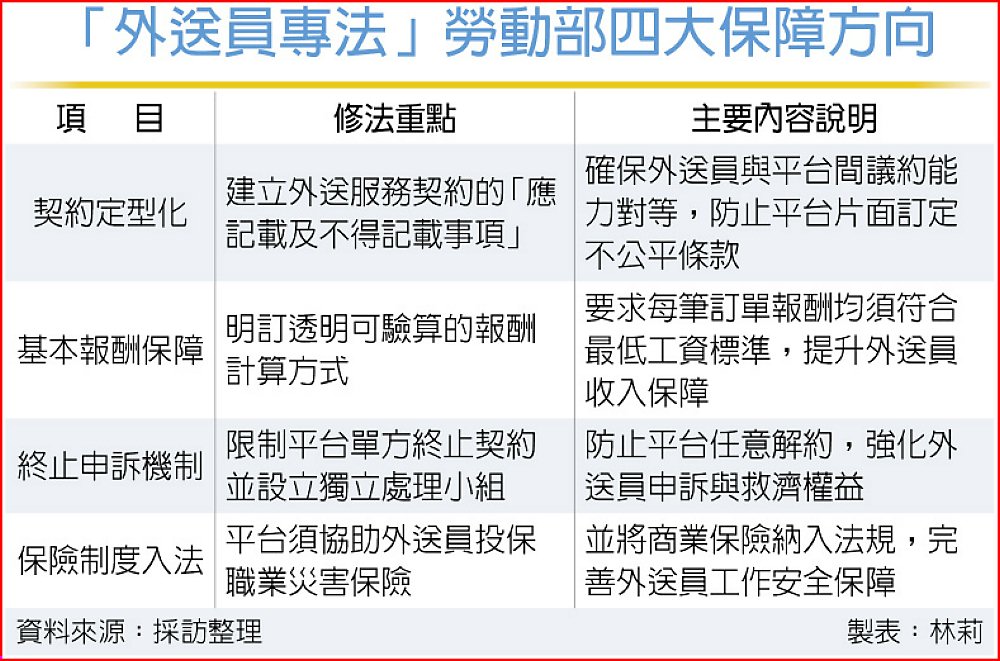 另外,限制平台單方終止契約的理由,並設立獨立處理小組,強化外送員申訴與救濟機制。及要求平台協助外送員投保職業災害保險,並將商業保險納入法規,以全面提升外送員工作安全。