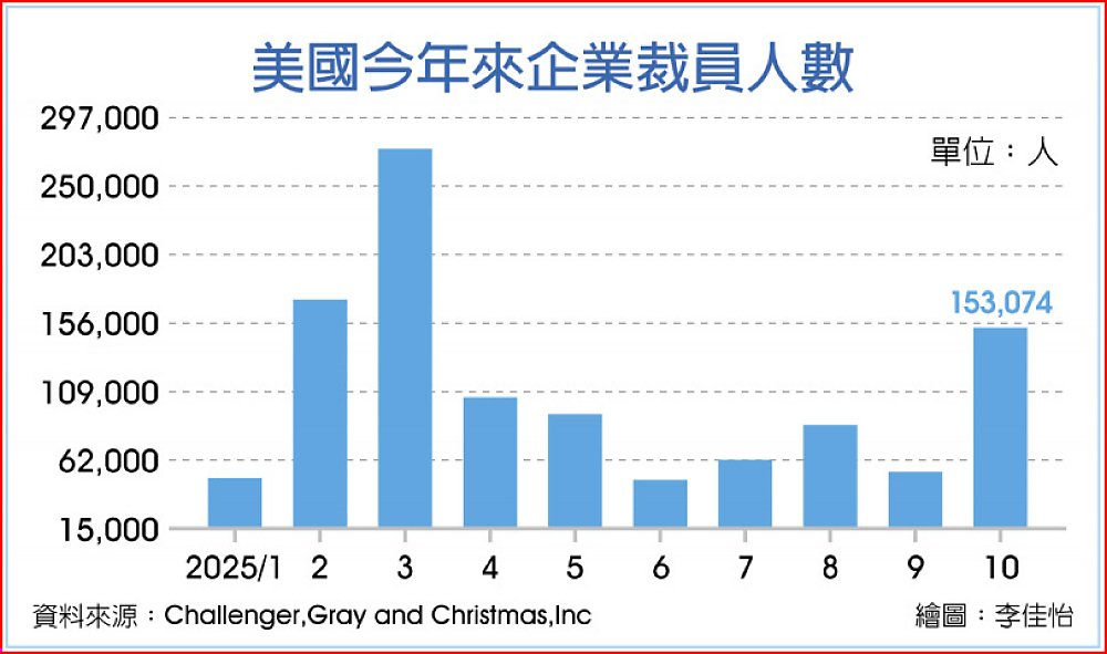 根據人力資源公司Challenger, Gray & Christmas在6日公布的數據,美國10月裁員人數高達153,074人,創下20年來同期最多裁員紀錄。報告指出,企業為控制成本與加速導入AI取代人力,是裁員潮的主要原因
