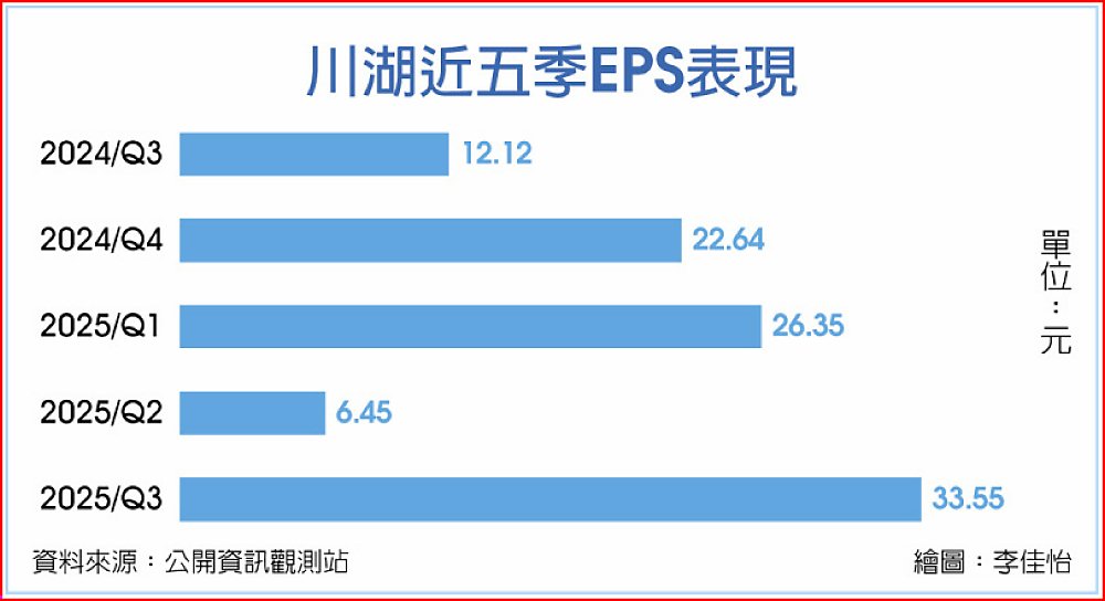 川湖7日將召開法說會,依照慣例在法說會前夕公告第三季財報。隨新台幣匯率回穩、單季營收持續攻頂,川湖第三季稅後純益31.97億元,創下單季獲利新高紀錄,年增176.8%,單季EPS 33.55元,一季獲利就超越整個上半年,累計川湖今年前三季稅後純益63.23億元,年增58.13%,EPS 66.35元,優於市場預期。由於GB300整機櫃已開始量產,拉貨動能漸次放大之下,法人不看淡川湖第四季營收。