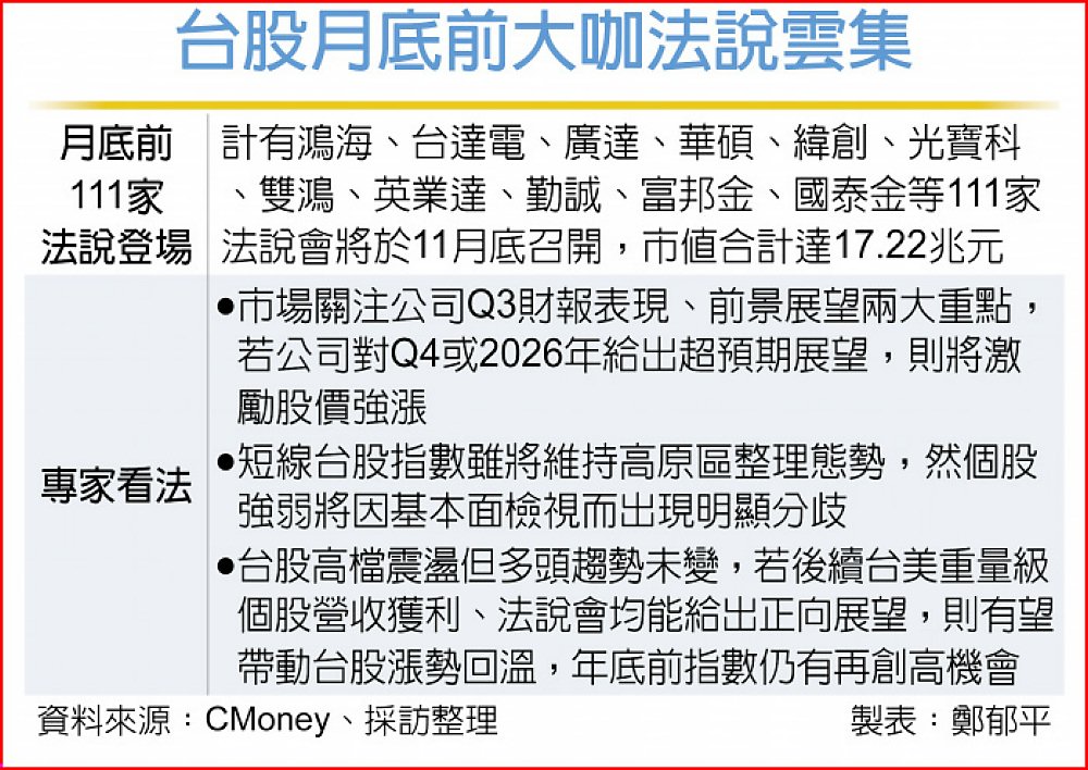 第一金投顧董事長黃詣庭分析,台股迎來法說會旺季,市場主要關注第三季財報表現、前景展望兩大重點,其中投資人對前景展望的期待又大於過去成績單,若公司對第四季或2026年給出超預期展望,則將激勵股價強漲;此外,短線台股指數雖將維持高原區整理態勢,然個股強弱將因基本面檢視而出現明顯分歧,預期法說會後易出現急漲或急殺表現。