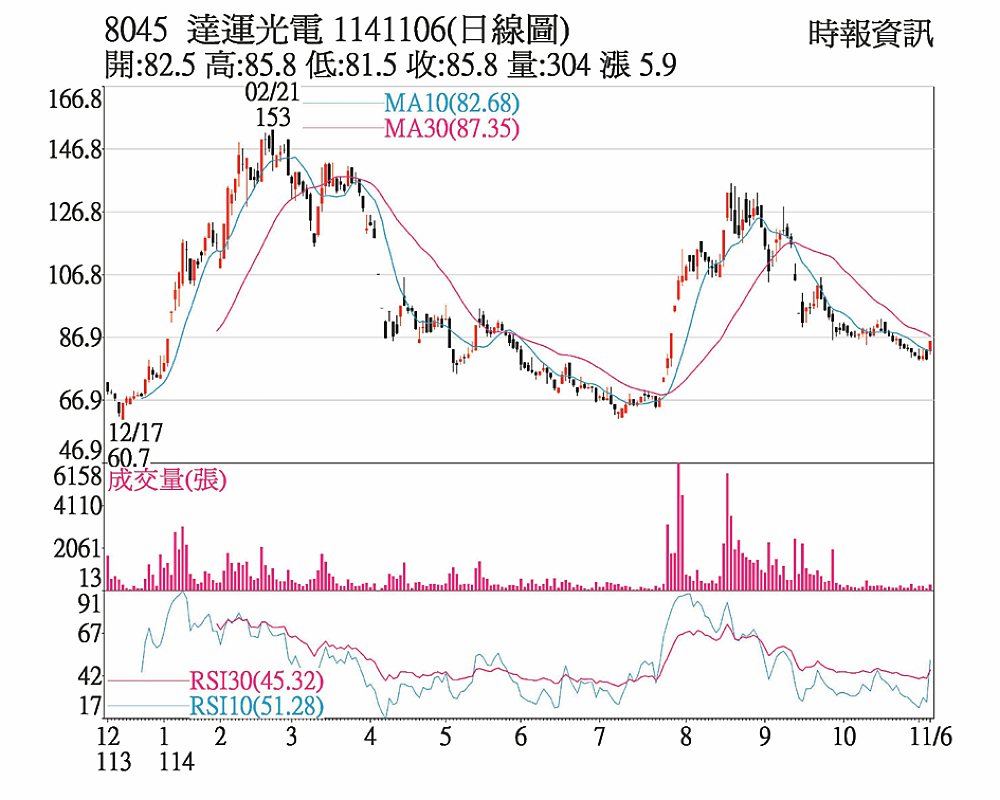 達運光電(8045)公布第三季財報,並調整高層人事,激勵買盤進場,拉升6日股價上漲7.38%,收在85.8元,該股歷經近二月修正後,表態價量具揚,有機會確認底部,後市若站穩月線約85.5元支撐,有機會持續彈升。