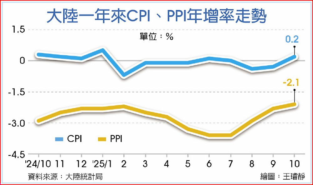 此外,受大陸部分行業供需關係改善、國際大宗商品價格傳導等因素影響,PPI年減2.1%,降幅比9月收窄0.2個百分點,連續第三個月收窄。