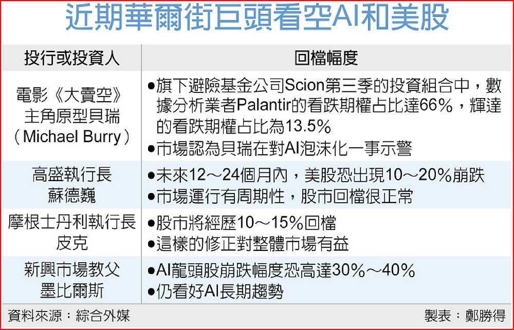 科技股上周遭拋售,令市場對股市修正的討論變多。高盛集團執行長蘇德巍(David Solomon)10月初便曾預測,在AI熱潮推動股市迭創新高後,未來一到兩年市場將出現修正,美股最多恐崩跌20%。