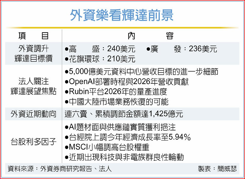 高盛指出,隨多項AI基礎設施相關公告與近期GTC大會強勁展望,投資人對本季業績期待感明顯提升;然同時也看好,輝達將公布優於預期的業績並上調財測,股價反應則取決於財測上調幅度。高盛重申對輝達「買進」投資評等,目標價上調至240美元。