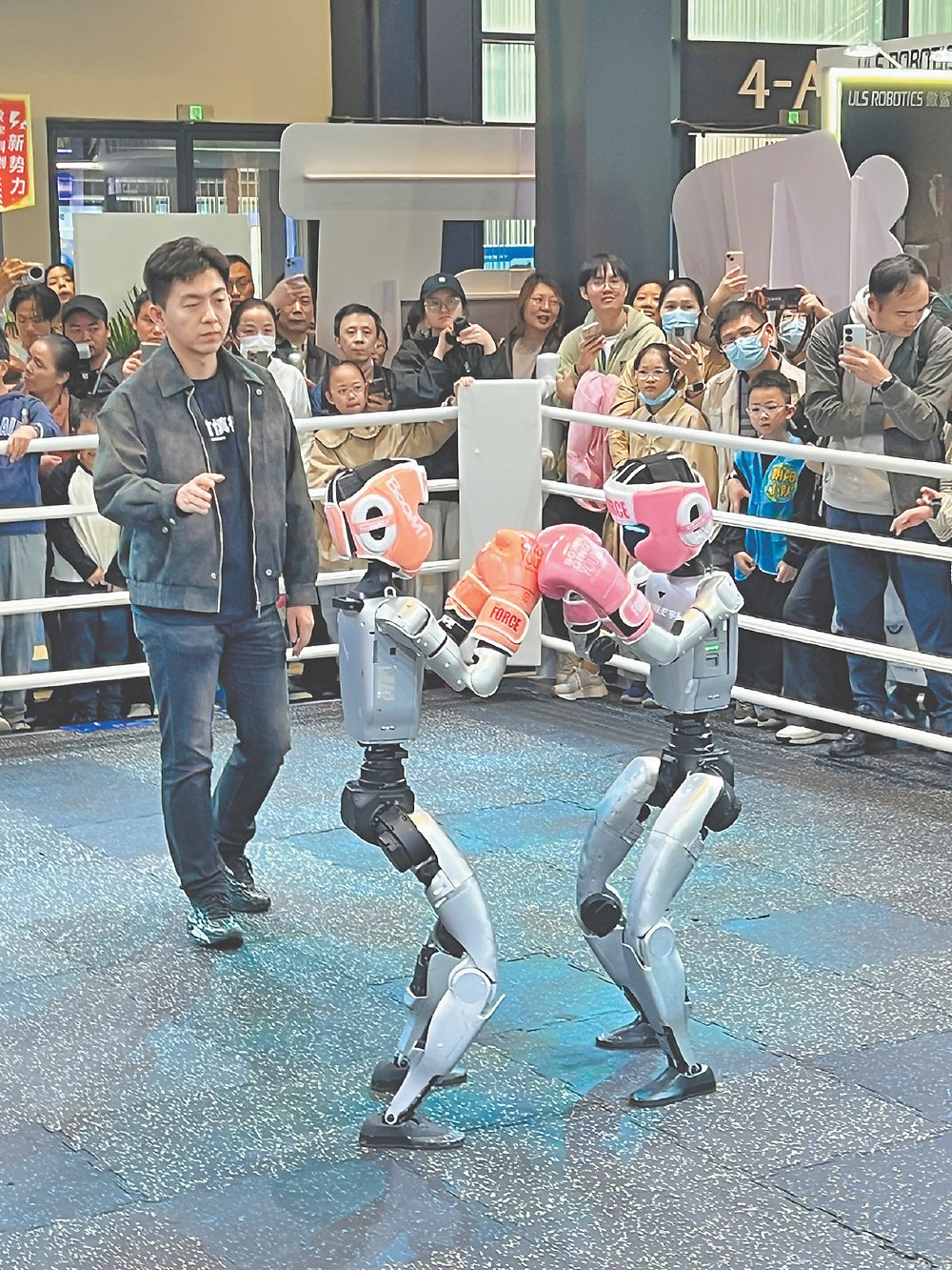 其中吸引最多人潮的,就屬宇樹科技的機器狗和機器人格鬥與跳舞。格鬥賽模擬真實的拳擊賽,讓對賽的機器人穿上頭盔和拳擊手套,也有裁判在一旁判定。