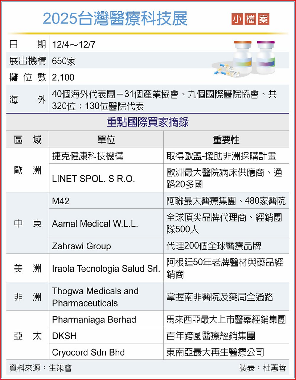 2025台灣醫療科技展將於12月4至7日登場,今年來自歐洲、美洲、亞太及中東非洲等地的國際買家,首次以「帶著採購清單」的方式來台「尋寶」。捷克健康科技機構啟動規模達2億歐元(約合新台幣71.65億元)的非洲醫療援助採購計畫,鎖定台灣為主要合作對象,掀起大採購熱潮。