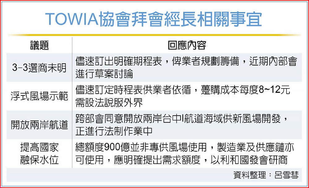TOWIA拜會經濟部高層,仍展現繼續開發台灣風場企圖心,一再反映區塊開發3-3期選商時程不明朗,不利整體風電發展動能,並呼籲固定式風機設置海域空間不足2GW,應盡速開放兩岸直航台中I航道。