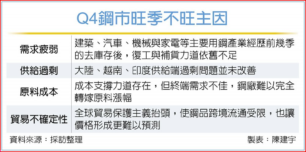 部分鋼廠嘗試以減產或調整盤價因應,但整體供需失衡、需求復甦遲緩與國際貿易不確定性等多重因素,持續壓抑鋼價與產業信心,鋼鐵業在歲末面臨嚴峻考驗,第四季旺季不旺幾乎已成定局。