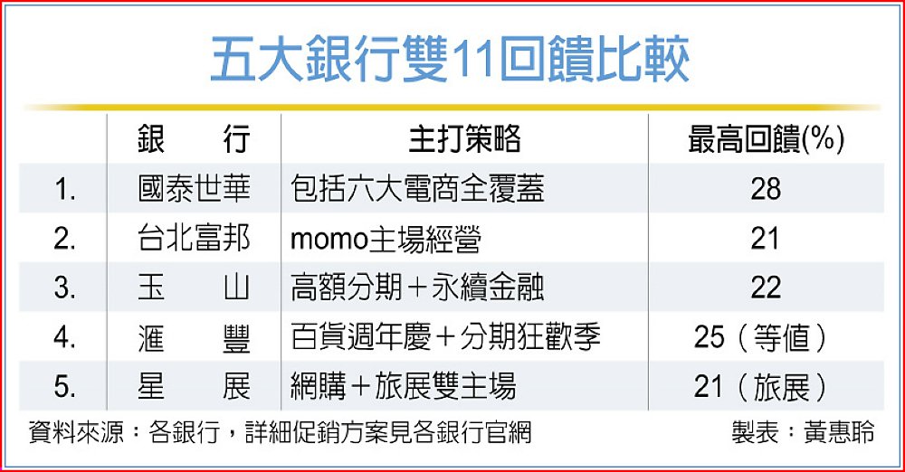 台北富邦銀行以momo聯名卡主場優勢,雙11檔期加碼回饋最高21%,並開放4萬名登錄名額,力拼全台最大規模促刷活動;玉山銀行以「高額分期+現折回饋」吸引高消費族群,蝦皮滿額有7,330元回饋,新戶申辦Unicard再加碼至22%。