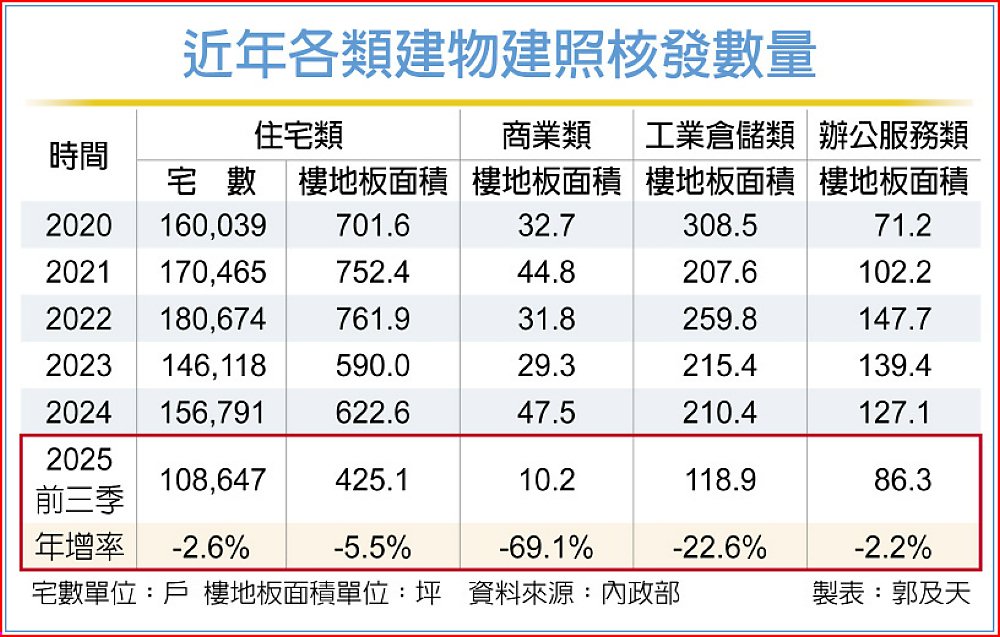 除住宅市場,與整體經濟發展高度相關的商業地產、工業地產,新供給也呈現衰退。包括商店、旅館、遊樂場的商業類來說,過去五年每年建照核發面積普遍在30萬坪以上,今年前三季僅10萬坪,年減幅高達近7成;而辦公室的辦公服務類今年前三季建照核發86萬坪,預估全年也不及過去三年每年逾120萬坪水準。