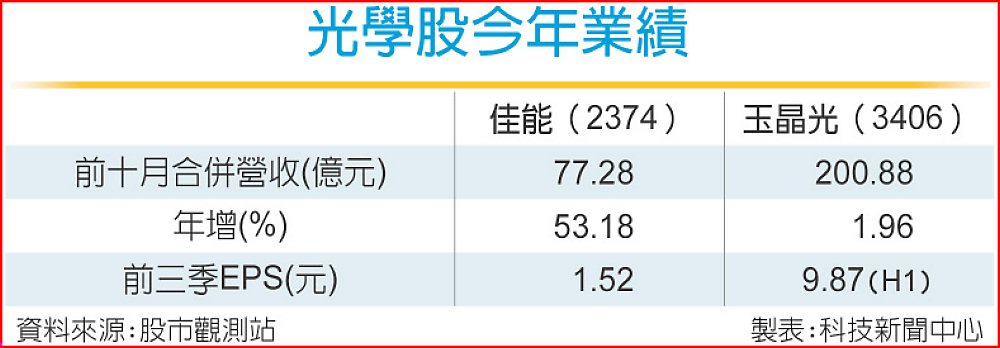 玉晶光今年前十月累計營收200.88億元,年增1.96%。玉晶光指出,第四季已非旺季高峰,預期營收會較第三季下滑,不過因為需求依舊旺盛,因此整季營收有機會較去年成長,但實際情況還是要看客戶拉貨狀況。