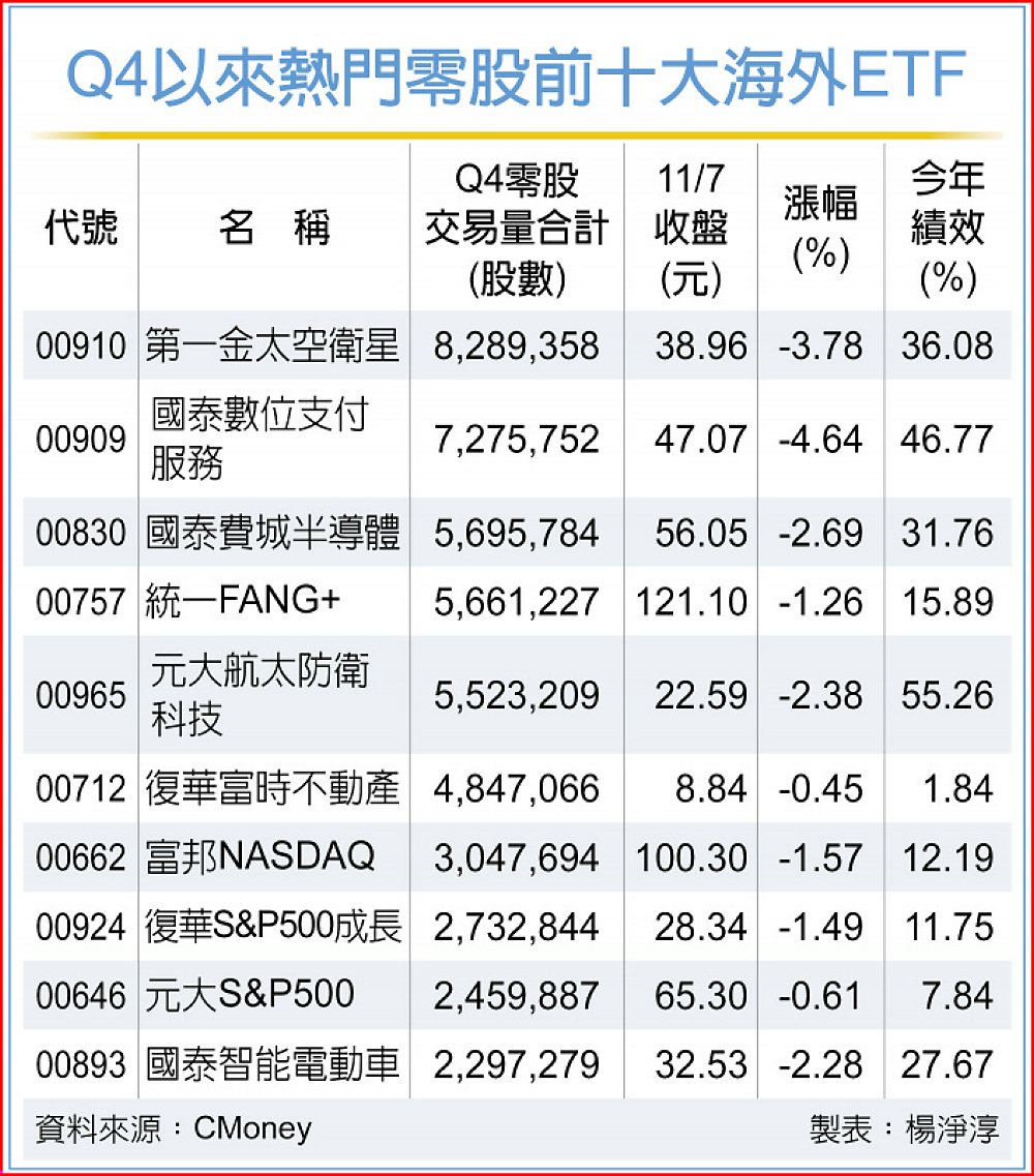 根據CMoney統計,第四季總計有26檔海外ETF以來合計零股交易量超過百萬股,其中,第一金太空衛星、國泰數位支付服務、國泰費城半導體、統一FANG+(00757)、元大航太防衛科技(00965)等5檔累計成交股數達828.94萬股~552.32萬股。觀察這幾檔海外ETF今年以來表現也相當亮眼,紛紛繳出雙位數績效表現,其中更有4檔漲幅逾30%。