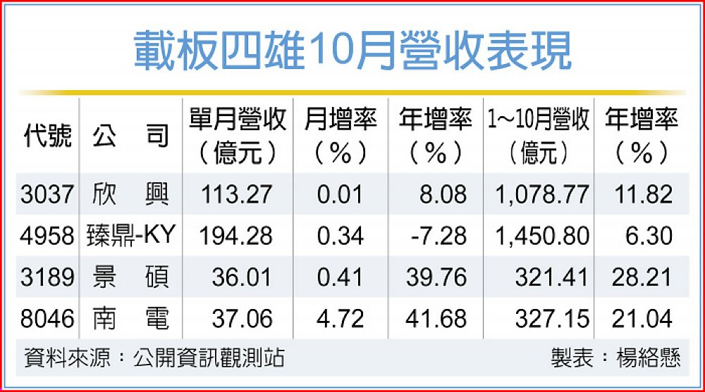 載板族群10月營收表現齊揚,欣興(3037)、景碩(3189)、南電(8046)皆繳出「年月雙增」成績,臻鼎-KY(4958)亦穩居高檔。AI伺服器與高階網通平台需求延續,加上BT載板報價調整與ABF良率改善,第四季動能維持強勁。隨新世代AI晶片導入、載板尺寸與層數同步提升,T-Glass供應緊張恐再升溫,有利載板廠報價,產業景氣將自2026年起再啟成長循環。