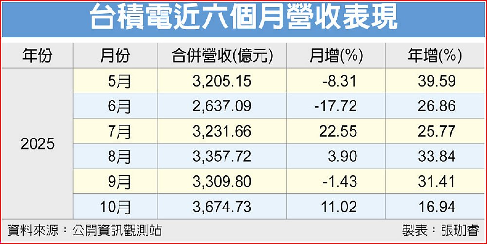 晶圓代工龍頭台積電受惠於AI需求強勁帶動,晶片業者排隊搶產能,10月合併營收3,674.7億元,月增11%、年增16.9%,再度締造歷史新猷。法人看好,第四季營收有望優於財測高標334億美元水準。