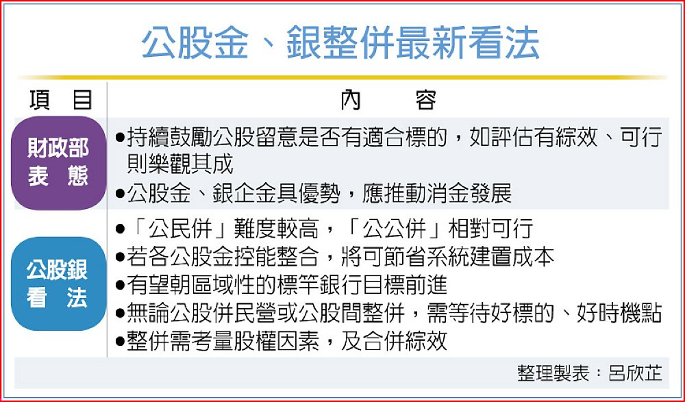 針對併購的議題,公股金控高層認為,「公民併」難度較高,「公公併」相對可行,若能整合各公司資源,將可節省系統建置成本,且各公股金控主要均以銀行為主體,證券、保險子公司規模較小,如果能整併起來,更有望朝區域性的標竿銀行目標前進。