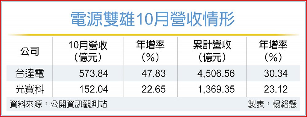 AI伺服器電力升級潮推動電源供應鏈持續走強。台達電、光寶科10月營收雙雙繳出年增雙位數成績,其中台達電已連續四個月改寫單月新高,光寶科則在雲端與高階伺服器電能管理系統出貨暢旺下維持高檔。法人指出,AI伺服器電力規格正加速升級,台廠具備完整系統整合與製造優勢,2026年前營運可望延續強勁循環。