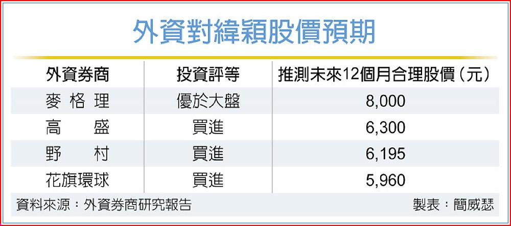 不僅麥格理大動作調升緯穎股價預期,花旗環球、高盛、野村證券最新賦予緯穎的推測合理股價,也分別來到5,960元、6,300元與6,195元,雖不及麥格理的8,000元那般「誇張」,卻都隱含相當大的潛在股價漲幅,同時,意味緯穎將會挑戰信驊的股王寶座。