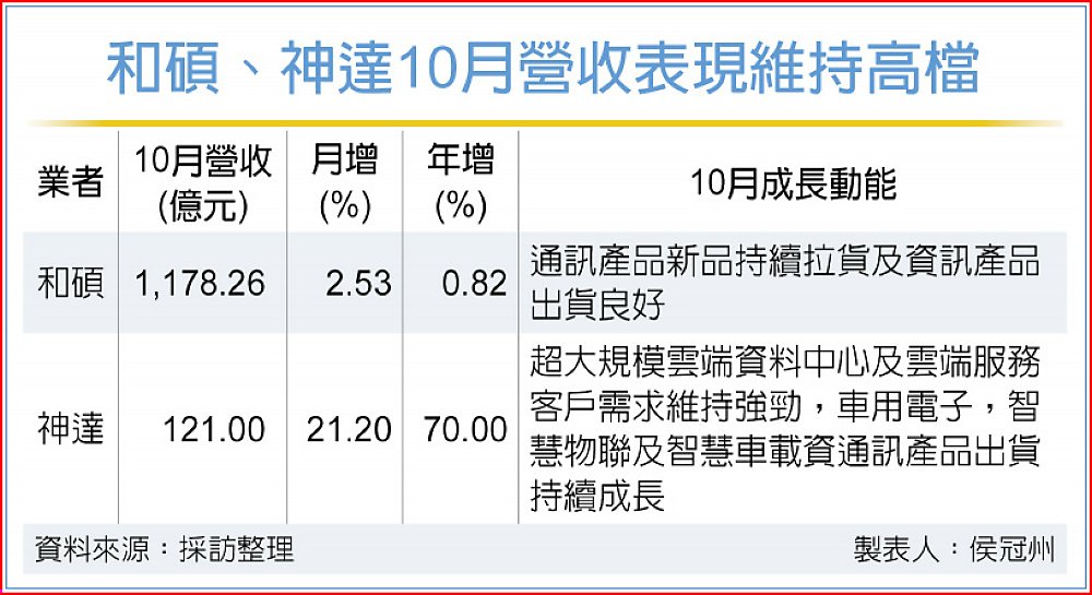 和碩、神達10月營收表現佳。和碩在通訊產品新品持續拉貨及資訊產品出貨良好挹注下,10月營收續站穩千億元,為1,178.26億元,月增2.53%、年減0.82%,公司將在11月12日舉辦法說會,屆時將釋出最新營運展望;神達則在AI伺服器需求持續強勁帶動下,10月營收衝上121億元,月增21.2%、年增70%,寫歷史新高,連續兩個月站上百億元,公司延續先前看法,預期第四季AI伺服器出貨表現仍能維持高檔。