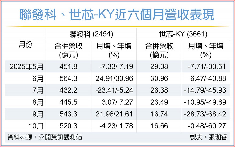 IC設計大廠聯發科旗艦級晶片出貨動能維持,10月營收維持高檔水準,呈月減、年增表現;除手機晶片外,聯發科多元布局,在Chromebook、衛星晶片及ASIC領域嶄露頭角。此外,ASIC公司世芯-KY 10月合併營收持續低迷,處大客戶晶片迭代空窗期,年減幅近6成,管理階層仍看好明年動能表現,其中,大客戶3奈米專案將於明年上半年進入量產,整體規模超過上一代,營運先蹲後跳。