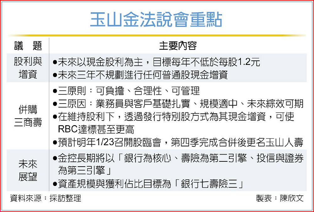 未來玉山金獲利成長除股利外將支援補強三商壽資本,另有保留盈餘約百億元,也可視為資本運用的備援,預期可讓三商壽RBC達200%的標準、甚至到250%。