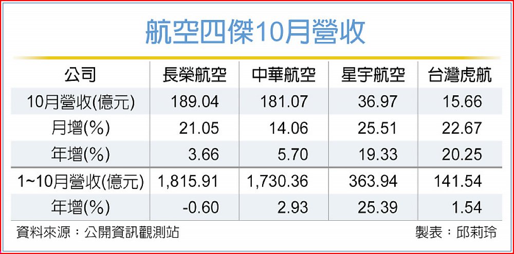 長榮航10月營收189.04億元,月增21.05%、年增3.66%;前十月營收1,815.91億元、年減0.60%;華航10月營收181.07億元,月增14.06%、年增5.70%;前十月營收1,730.36億元、年增2.93%; 星宇10月營收36.97億元,月增25.51%、年增19.33%;前十月營收363.94億元、年增25.39%;虎航10月營收15.66億元,月增22.67%、年增20.25%;前十月營收141.54億元、年增1.54%。