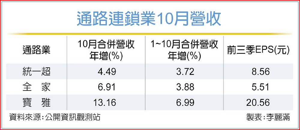 受惠中秋、雙十、光復等節慶連假帶動消費,通路業10月營收亮眼,超商雙雄統一超、全家,美妝生活通路商寶雅,10月及前十月營收均創同期新高。