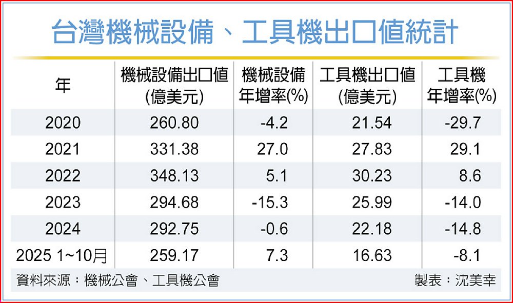 機械公會指稱,美國與大陸是台灣機械出口的前兩大市場,前十月台灣對大陸機械出口值59.2億美元、年增5.3%,對美國出口值68.3億美元、年增14.1%。歷經美國對等關稅影響,對美出口上下震盪,目前不確定性逐漸降低,對美出口逐漸回復穩定,全球製造業有機會逐漸回溫。