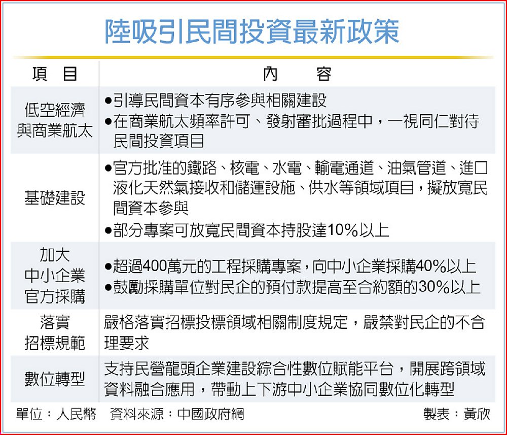 大陸官方促投資再出招。大陸國務院辦公廳10日公布「進一步促進民間投資發展的若干措施」,其中包括低空經濟、商業航天領域鼓勵民營資本進入;同時在能源、鐵路、核電等基礎建設放寬允許民間資本進入等13項政策,支持民間投資。
