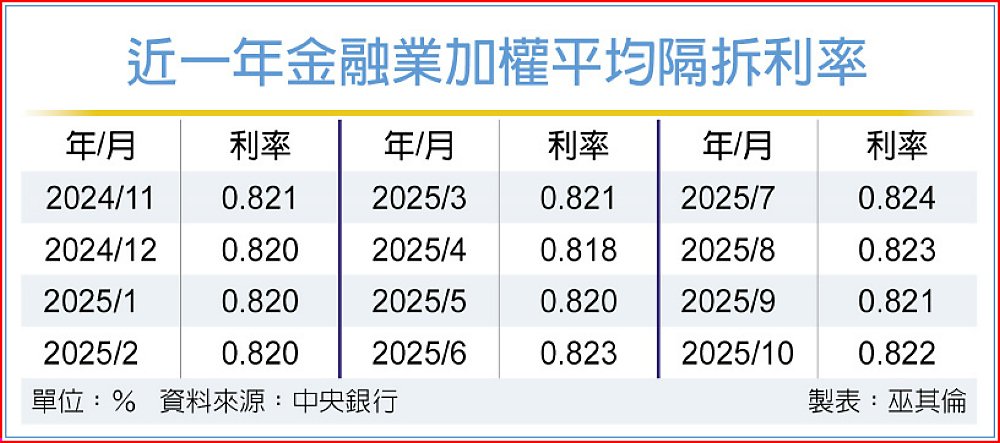 根據央行統計,10月金融業隔夜拆款利率最高達0.825%,且單月最低也僅0.818%,全月幾乎都維持在相對偏高位置,平均隔拆利率也如預期上修至0.822%,已連續19個月維持在0.8%以上。央行說明,拆款利率是指金融機構間互相借貸的利率,拆款市場分為12個天期,最短天期為隔夜(次營業日即清償),稱為「隔夜拆款利率」。