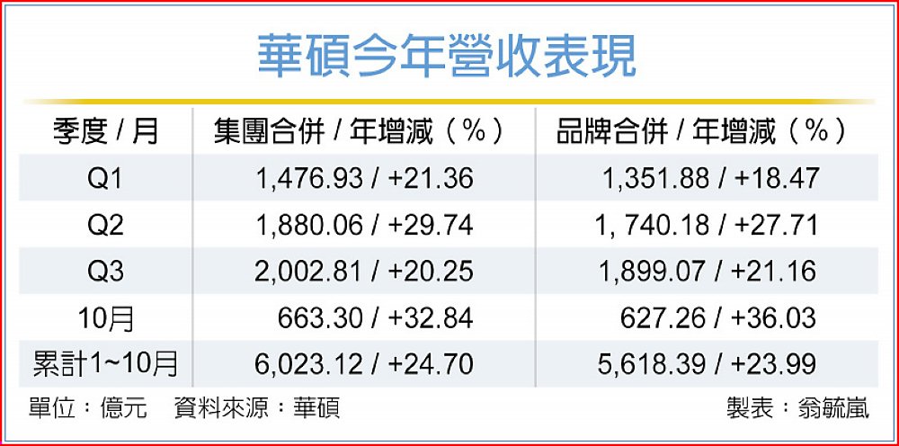 華碩於第三季季底出貨高峰後,10月業績較9月高基期回檔25%,但電競、板卡等產品線延續動能,加上雙十一電商檔期啟動備貨效應,其單月集團合併營收663.3億元、品牌合併營收627.26億元,年增皆超過3成,同步再寫下同期新高,亦創單月歷史第四高。
