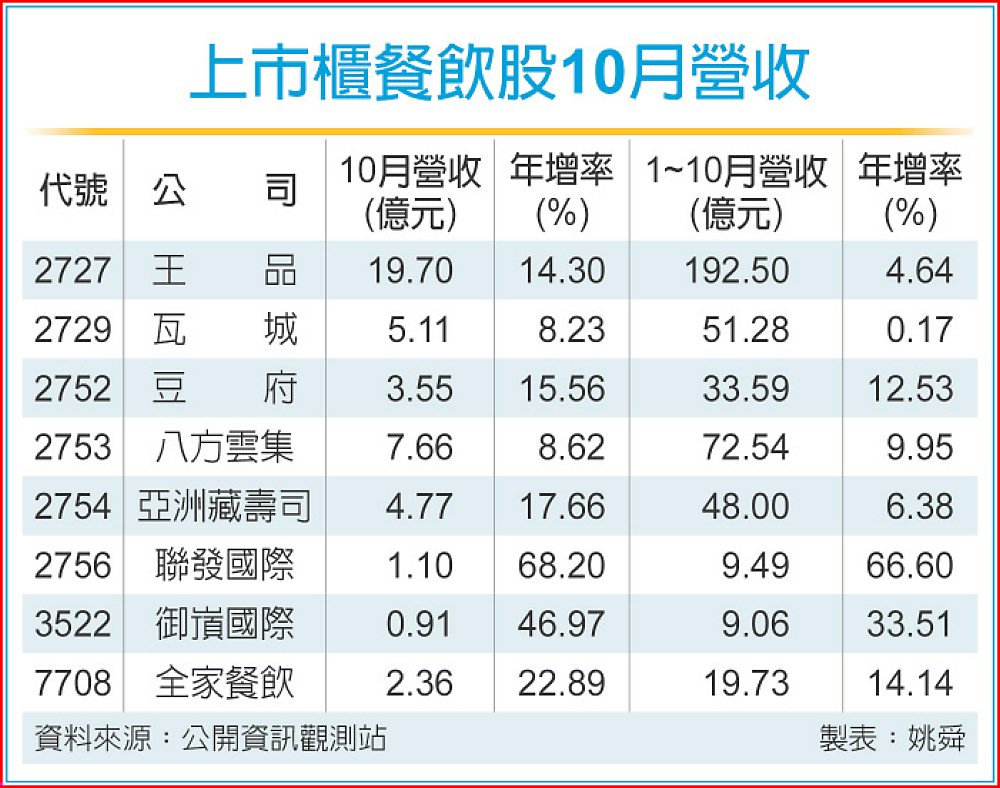 受惠展店效益,及連假、百貨公司周年慶助攻,王品(2727)、瓦城(2729)、豆府(2752)、八方雲集(2753)、亞洲藏壽司(2754)、聯發國際(2756)、御嵿(3522)、全家餐飲(7708)、開展(7789)、饗樂Q Burger(7797)等連鎖飲集團,10月與前十月營收均創同期新高。