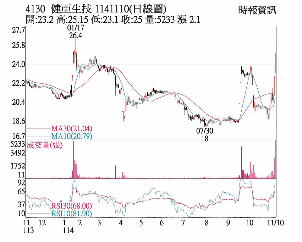 健亞(4130)在特定買盤介入下,連兩日爆量大漲,10日一度觸及漲停價25.15元,終場收25元、漲幅9.17%,改寫近八個月新高,成交量5,189張。該股先前雖躲過健喬公開收購危機,不過因經營團隊持股不足,且近日量能放大,是否再引爆經營權之爭,備受關注。
