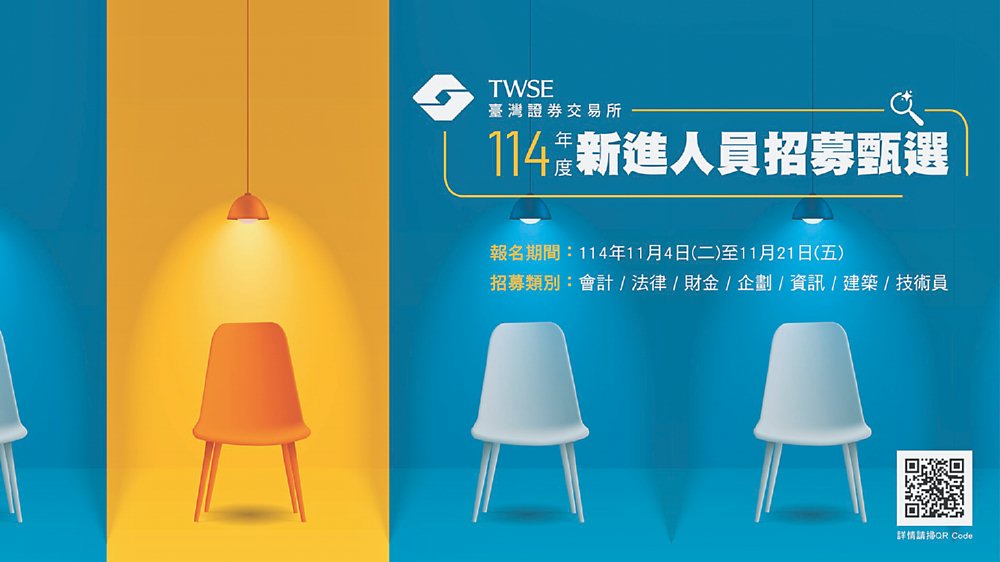 證交所表示,新進人員招募甄選報名至11月21日(周五)止,一律採網路報名。詳細資訊請參閱證基會網站招募專區,報名網頁:https://examweb.sfi.org.tw/twse20251213。