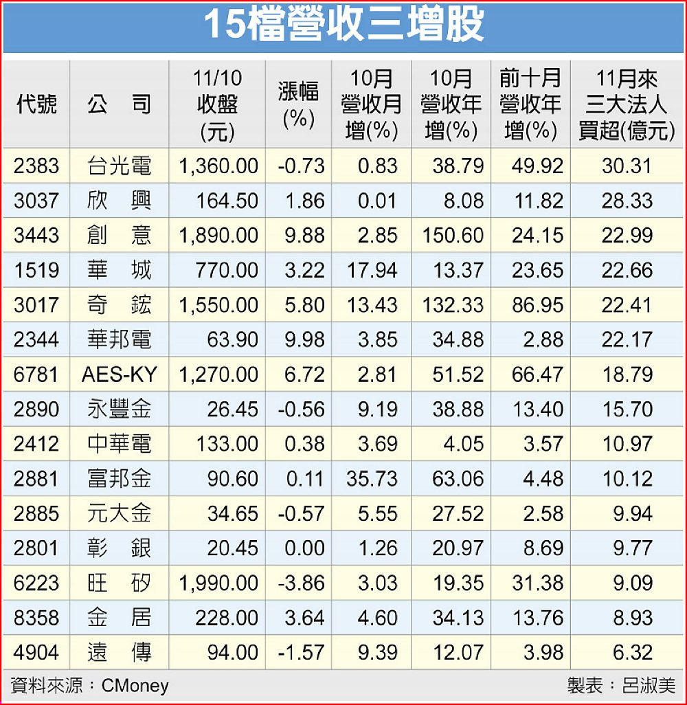 據統計,1,900多檔上市櫃股中,10月合併營收呈現月增及年增共有511檔,加計前十月合併營收年增,則有369檔,再從這369檔個股篩選三大法人11月到10日止,買超6億元以上有台光電、欣興、創意、華城、奇鋐、華邦電、AES-KY、永豐金、中華電、富邦金、元大金、彰銀、旺矽、金居、遠傳等15檔。