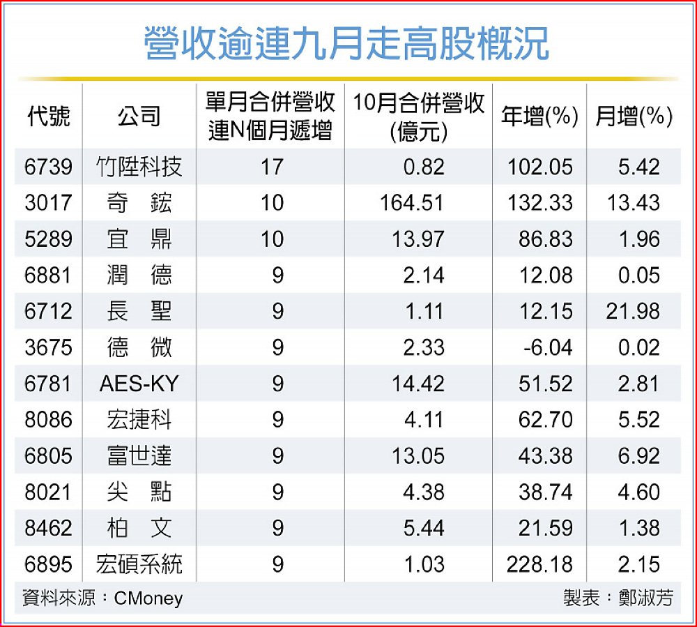 從10月營收表現亦可看出AI戰火仍旺,經統計,營收步步高個股中以竹陞拔得頭籌,連17個月走高,連十月走高股包括奇鋐、宜鼎,連九個月走高的包括潤德、長聖、德微、AES-KY、宏捷科、富世達、尖點、柏文、宏碩系統,連八月成長僅台揚一檔,連6月成長者則包括台達電、勤凱、蒙恬、立誠、jpp-KY。