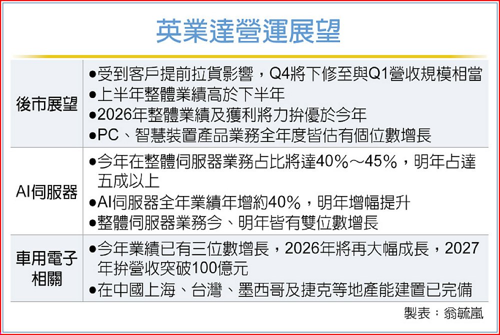 短期營運受前幾季提前拉貨影響,淡旺季週期出現變化,英業達預估第四季業績規模與第一季相當,但隨產品結構優化與生產效率提升,毛利率將回升。