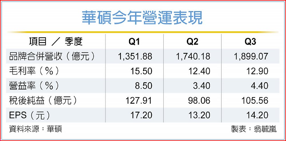 展望第四季,先前提前拉貨與進入傳統淡季影響,華碩預期PC業務季減10%~15%、與去年同期持平,板卡及伺服器業務估季減5%~10%,其中板卡業務持平上季,惟伺服器業務在前一波出貨高峰後,配合客戶拉貨時程下將走緩,但該部分業務仍有上看50%的強勁年增長。